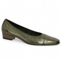 Ici présentée en cuir métalisé bronze avec des reflets vert kaki, le modèle est aussi disponible en noir.