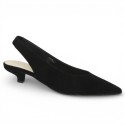 Découvrez l'escarpin "Petula" ouvert au talon (slingback), une chaussure d'une grande finesse confectionnée en cuir velours noir. Sa coupe est assez couvrante sur le dessus du pied.