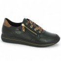 Découvrez les sneakers "April" en cuir noir. Ces chaussures, au design épuré, se démarquent par leurs jolies finitions, mettant en valeur ses œillets métalliques et des détails dorés et bronze qui ajoutent une touche moderne et sophistiquée.