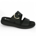 Elle est agrémentée d’une boucle ronde dorée et vernie noir, apportant une touche chic et raffinée à l’ensemble. Pratique à enfiler, elle se referme facilement grâce à une bride à scratch qui permet un ajustement parfait du pied.